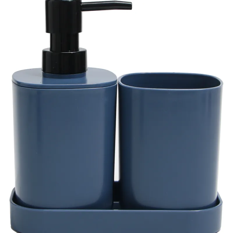 Tuo yhdenmukaista ilmettä kylpyhuoneeseen! Kotikulta-kylpyhuonesetti sisältää muovisen saippuapumpun, kylpyhuonemukin ja saippua-alustan samassa sinisen sävyssä.