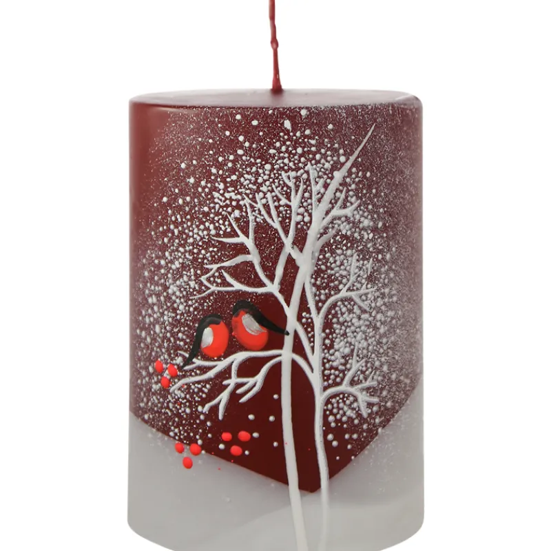 Punatulkkukuvan koristama Kotikulta-pöytäkynttilä tuo valoa talveen. Parafiinikynttilän korkeus on noin 10 cm ja paloaika noin 40 tuntia.