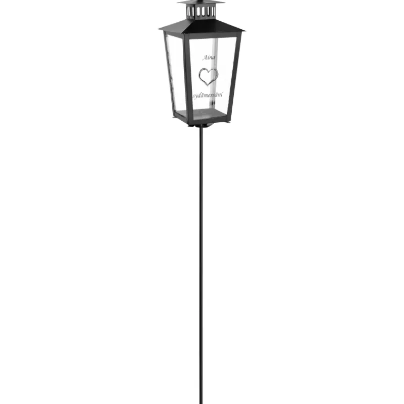 Kotikulta Sydämessäni-hautalyhty maahan upotettavalla tikulla. Materiaali metalli/lasi. Lyhtyosan koko on 14 x 14 x 30 cm, metallitikun pituus on 1 m. Lyhdyssä on teksti: Aina sydämessäni, väri musta.