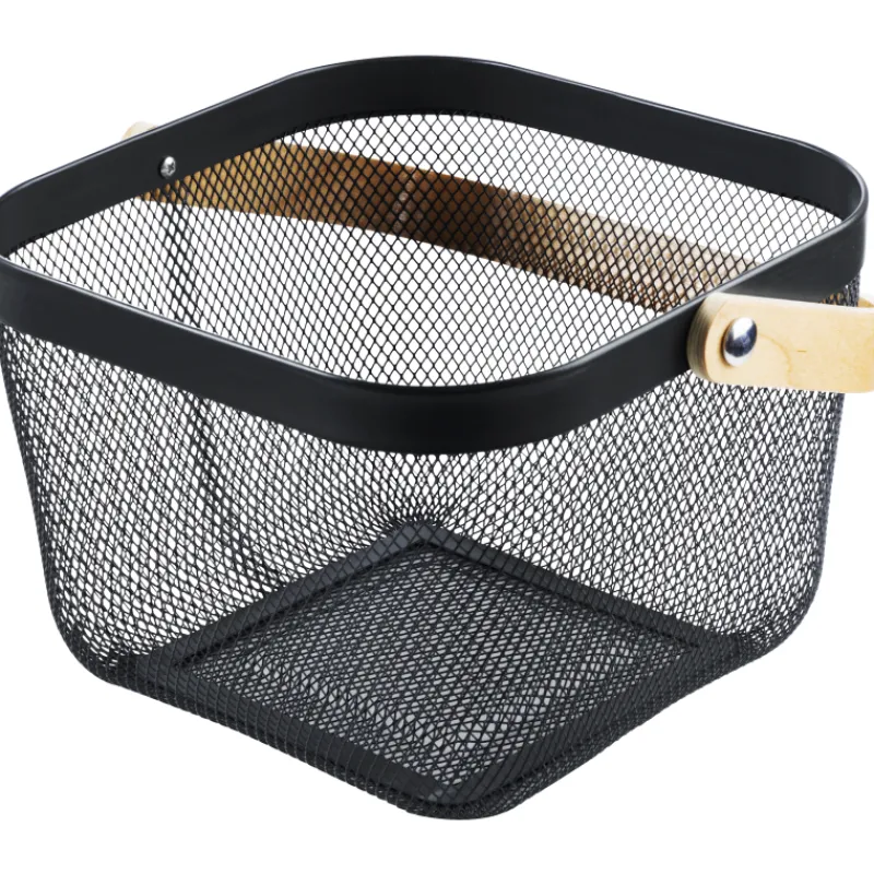 Mustan korin koko on 26 x 26 x 29,5 cm. Materiaali on metallia ja puuta.