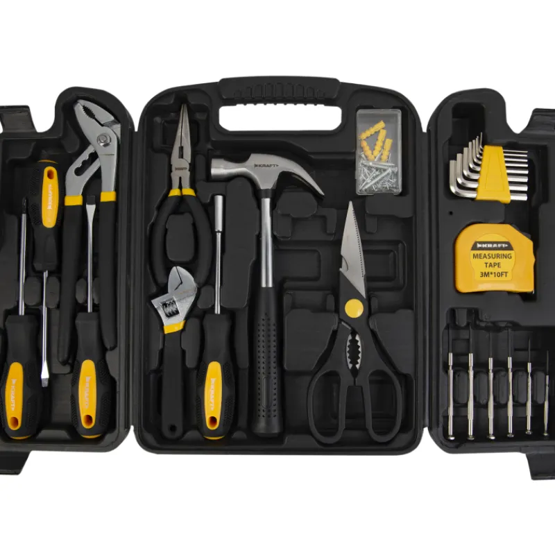 Pakkauksen sisältö: 3x ruuvimeisseli, kärkipihdit, jakoavain, sakset, siirtoleukapihdit, ruuvimeisselivarsi vaihtokärjille, 20 x ruuvikärjet, 6 x tarkkuusruuvimeisseli, mittanauha 3,5 m, 8 x kuusiokoloavain, vasara. Sekä valikoima erilaisia kiinnikkeitä.Työkalut on valmistettu korkealaatuisista materiaaleista, kuten hiiliteräksestä ja Cr-V teräksestä.