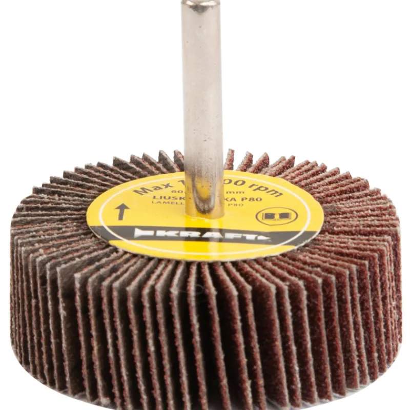 Kraft porakonekiinnitteinen liuskalaikka hiomiseen. Koko 60 x 20 x 6 mm. Karkeus 80. Liuskalaikassa on 6 mm kara. Kierroslukumäärä max 12 700 rpm.