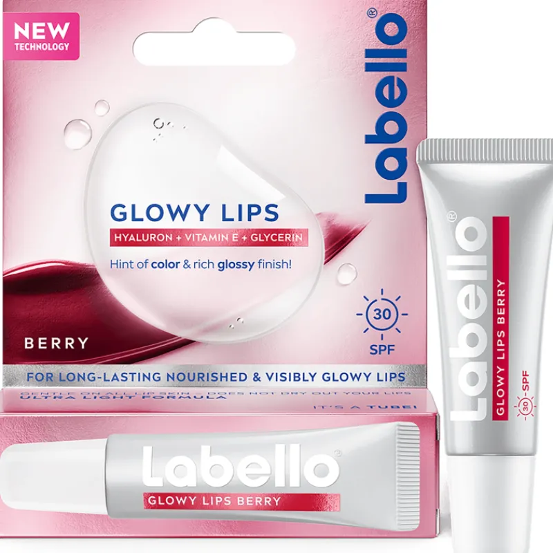 Labello Glowy Lips Berry -huulivoide kosteuttaa huulia tehokkaasti hyaluronihapon, E-vitamiinin ja glyseriinin avulla. Se antaa huulillesi läpikuultavan, kerrostettavan sävyn ja kiiltävän lopputuloksen. Suojakerroin 30 suojaa huulia UVA- ja UVB-säteilyltä.