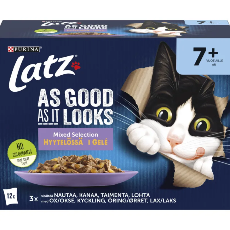 Latz As Good As It Looks Senior -tuotesarjan ateriat näyttävät, tuoksuvat ja maistuvat yhtä herkullisilta kuin itse tehdyt. Laadukkaista aineksista valmistetut annokset sisältävät mureita paloja mehevässä hyytelössä. Yli 7-vuotiaille kissoille suunnitellut ateriat sisältävät juuri oikeanlaisen yhdistelmän proteiineja, vitamiineja ja antioksidantteja, jotka tukevat kissan elinvoimaisuutta. Kissanruoan terveelliset ainesosat tyydyttävät 100 % kissasi päivittäisistä tarpeista, kun ruokinta noudattaa pakkauksen ruokintaohjeita.