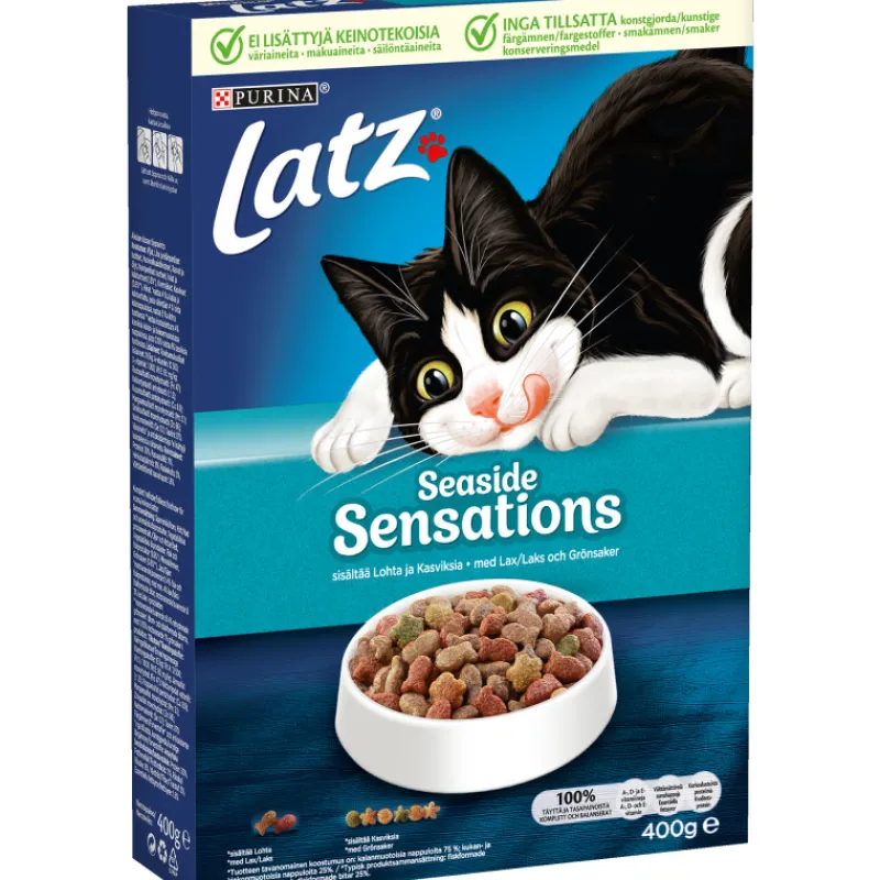 Latz Sensations on 100 % täysravintoa kissallesi! Sensations kissan kuivaruokasarja on maukas ja täysipainoinen ravinto aikuisille kissoille. Latz Sensations kalaa sisältää lohta, lyyraturskaa ja lisättyjä kasviksia. Pakkauskoko 400 g.