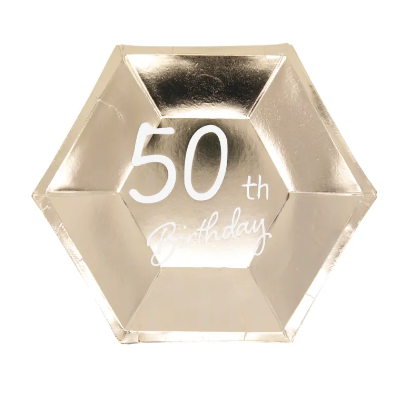 Juhlista syntymäpäivää teemaan sopivalla kattauksella! Kullanvärisessä Let’s Party -kertakäyttölautasessa lukee ”50th Birthday”. Kartonkilautasen halkaisija on 18 cm.