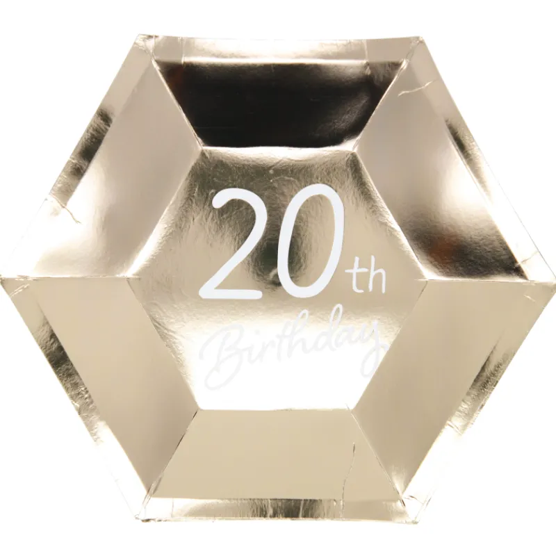 Juhlista syntymäpäivää teemaan sopivalla kattauksella! Kullanvärisessä Let’s Party -kertakäyttölautasessa lukee ”20th Birthday”. Kartonkilautasen halkaisija on 23 cm.