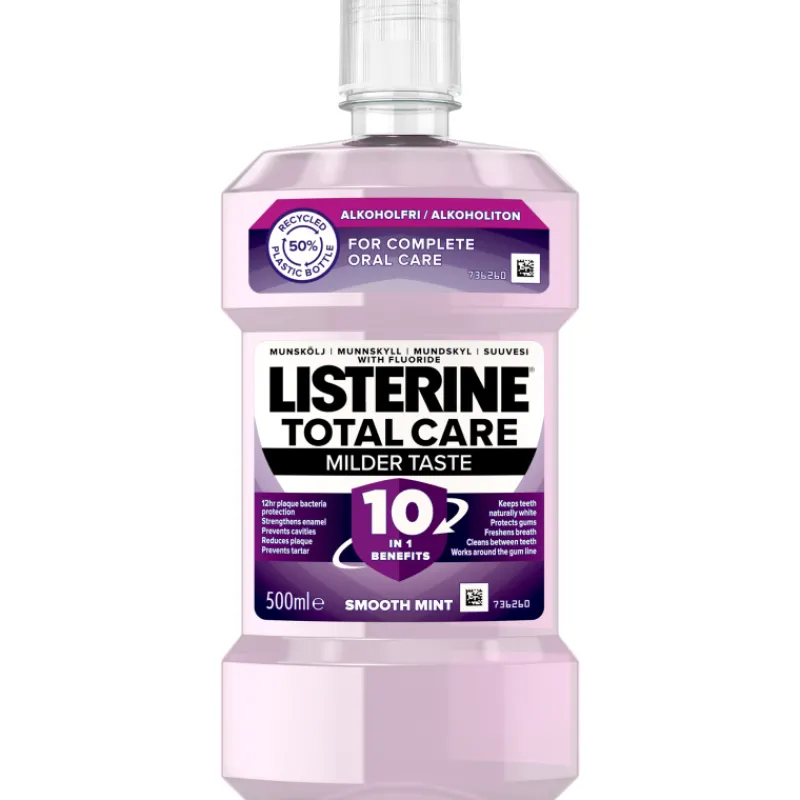 Alkoholiton ja miedomman makuinen Listerine Total Care Milder Taste -suuvesi puhdistaa koko suun perusteellisesti. Suuvesi myös raikastaa hengityksen jopa 12 tunnin ajaksi! Käytä kahdesti päivässä hampaien harjauksen jälkeen. Yli 12-vuotiaille.