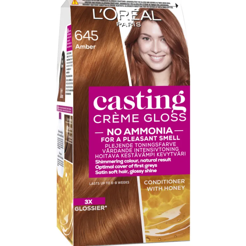 L’Oréal Casting Gloss -hiusväri Amber 645 Meripihka antaa hiuksiisi luonnollisen kiiltävän vivahteen täysin ilman ammoniakkia. Casting Gloss sopii täydellisesti, kun haluat korostaa luonnollista hiusväriä ja antaa sille uutta kiiltoa. Voidemainen kevytväri kestää hiuksissa jopa 6-8 viikkoa.