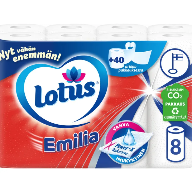 Lotus Emilia on imukykyinen ja kestävä talouspaperi. Se soveltuu hyvin pintojen pyyhkimiseen ja puhdistamiseen, sillä se on kestävä myös märkänä. Lotus Emilia on niin imukyinen, että yksikin arkki voi riittää!