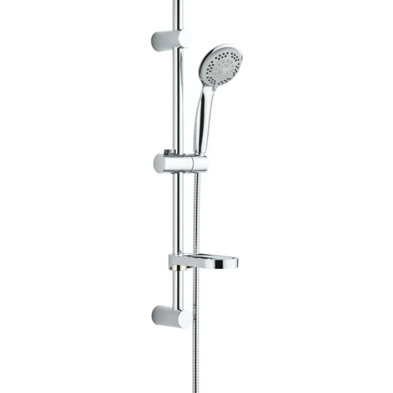 Kromattu Fashion käsisuihkusetti. Kromattu teräsputki 25 x 720 x 0,4 mm. Säädettävä 10 cm käsisuihku viidellä erilaisella toiminnolla. 150 cm x 14 mm double spiral teräs letku, EPDM sisäletkulla. Kromattu saippuateline.