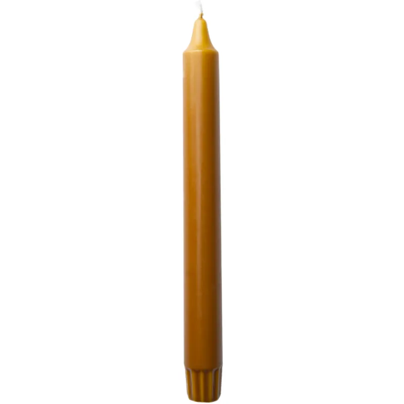 Tyylikäs Marimekko-kruunukynttilä on valmistettu 100 % steariinista. Sinapinkeltaisen kynttilän korkeus on 24 cm ja paloaika noin 8 tuntia.