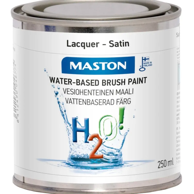 Maston H2O! on nopeasti kuivuva, puolikiiltävä vesiohenteinen lakka sisä- ja ulkokäyttöön. Maali soveltuu puu- ja metallipinnoille. Riittoisuus 7-8 m2/l.