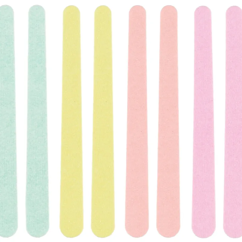 Kahdeksan paperista kynsiviilaa kauniissa pastellin sävyissä.