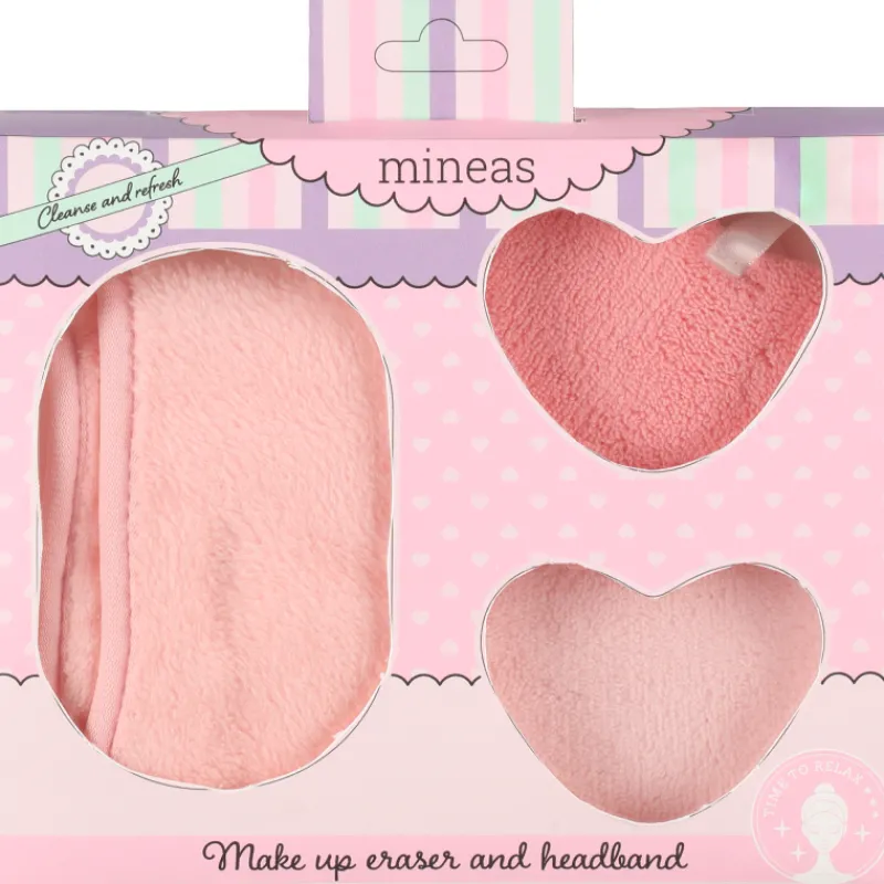 Mineas meikinpoistosetti on ihastuttava apuri kasvojen hellävaraiseen puhdistamiseen. Pakkaus sisältää kaksi pehmeää meikinpoistoliinaa ja pehmeän hiuspannan, minkä avulla hiukset pysyvät poissa kasvoilta puhdistuksen aikana.