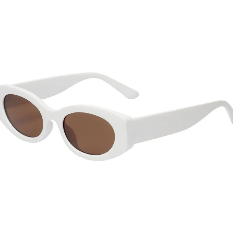Matalat, kaarevan muotoiset Miny-aurinkolasit sopivat niin kaupunkiin kuin rannalle. Aurinkolaseissa on paksut, valkoiset muovisangat ja ruskeat linssit.