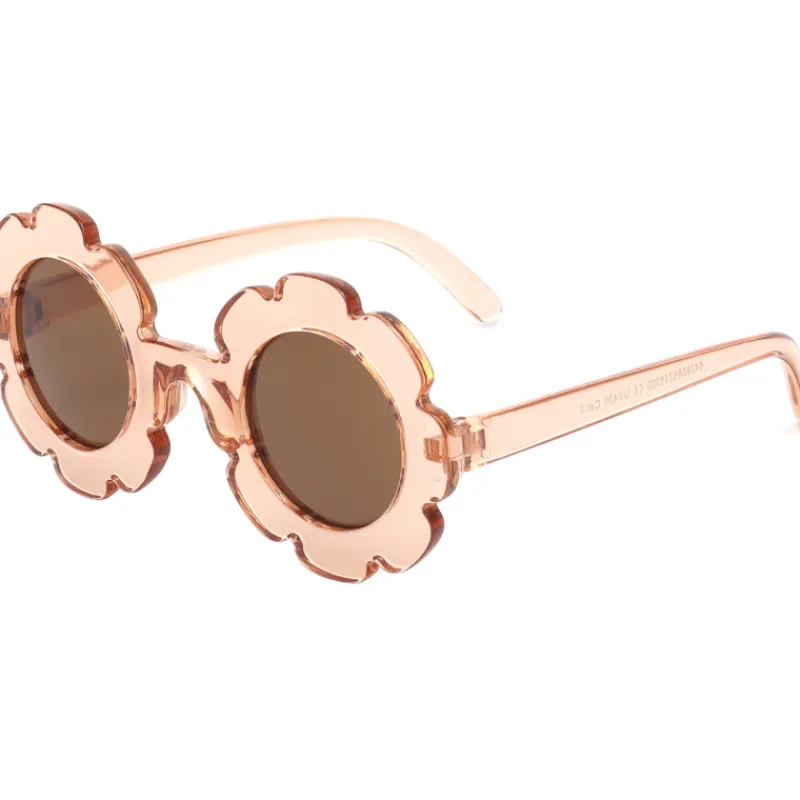 Kukanmuotoiset Miny-aurinkolasit tuovat hauskaa tyyliä lasten kesäpäiviin! Aurinkolaseissa on läpikuultavat ruskeat muovisangat ja ruskeat polykarbonaattilinssit.