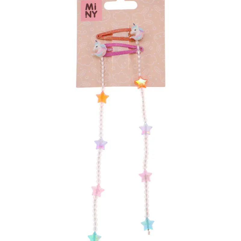 Upeat lasten hiuspinnit, joiden roikkuvat tähtihelminauhat uppoutuvat kauniisti hiuksiin. Kimaltavissa pinneissä myös yksisarviskoriste.