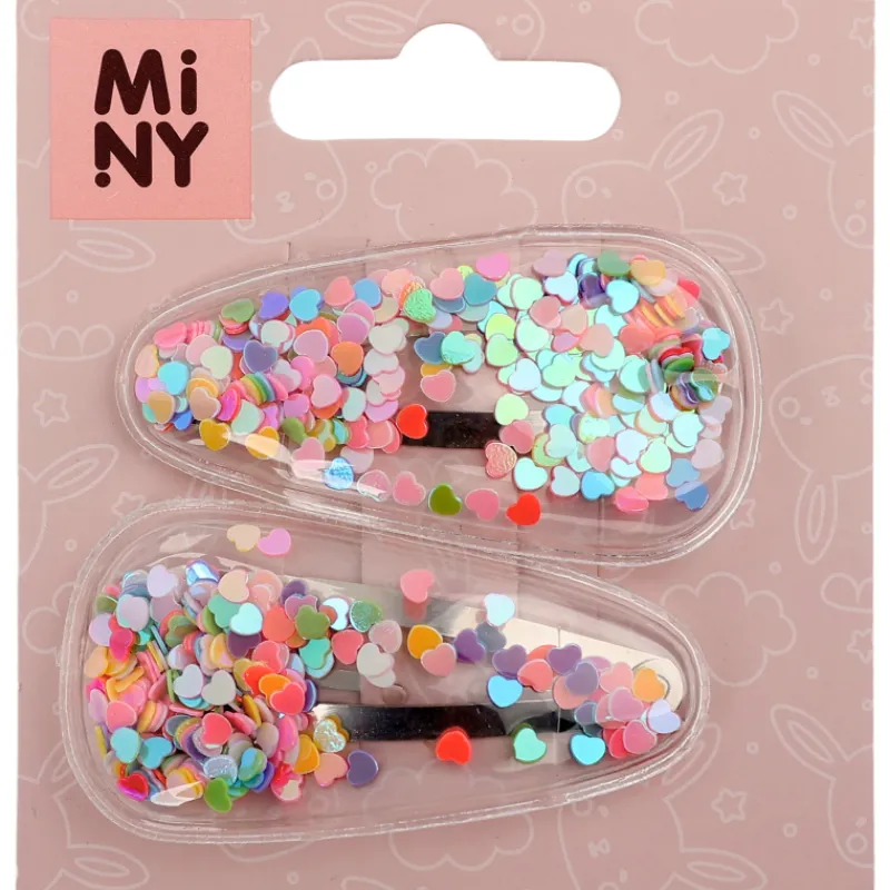 Miny-hiuspinni kahden kpl:n pakkauksessa. Värikkäitä paljetteja somisteina läpikuultavissa pinneissä. Nikkeli-vapaa.