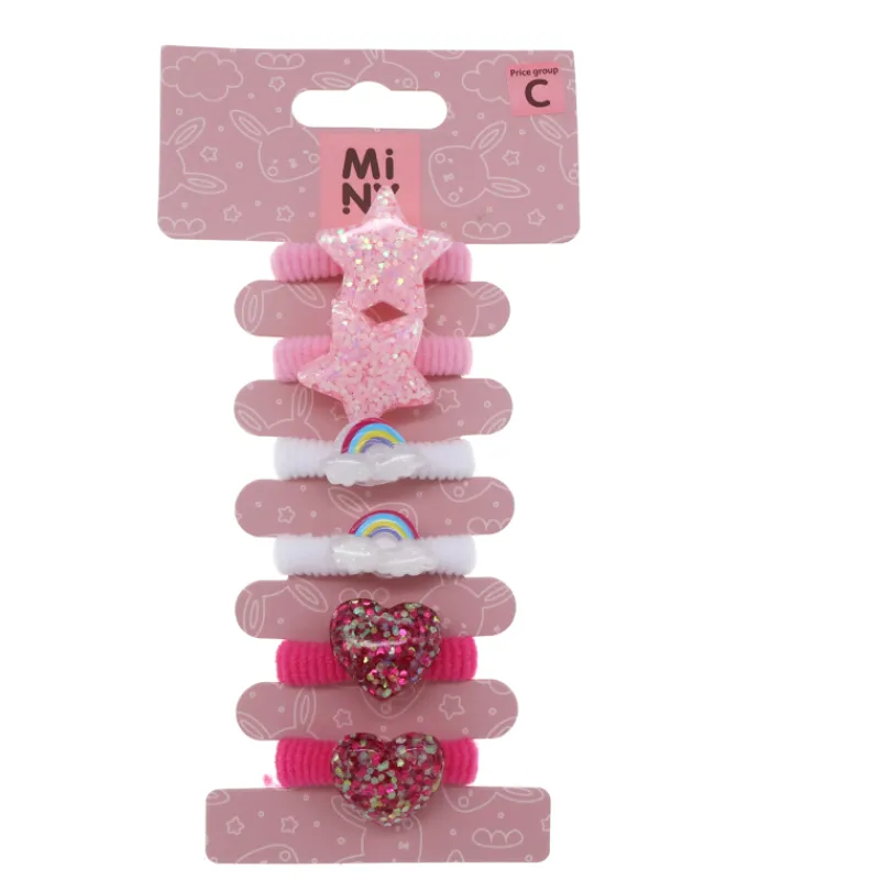 Lasten hiuspompulat pitävät hiukset sievästi kiinni. Pakkauksessa kolmea eri koristusta: tähti, sateenkaari ja sydän.