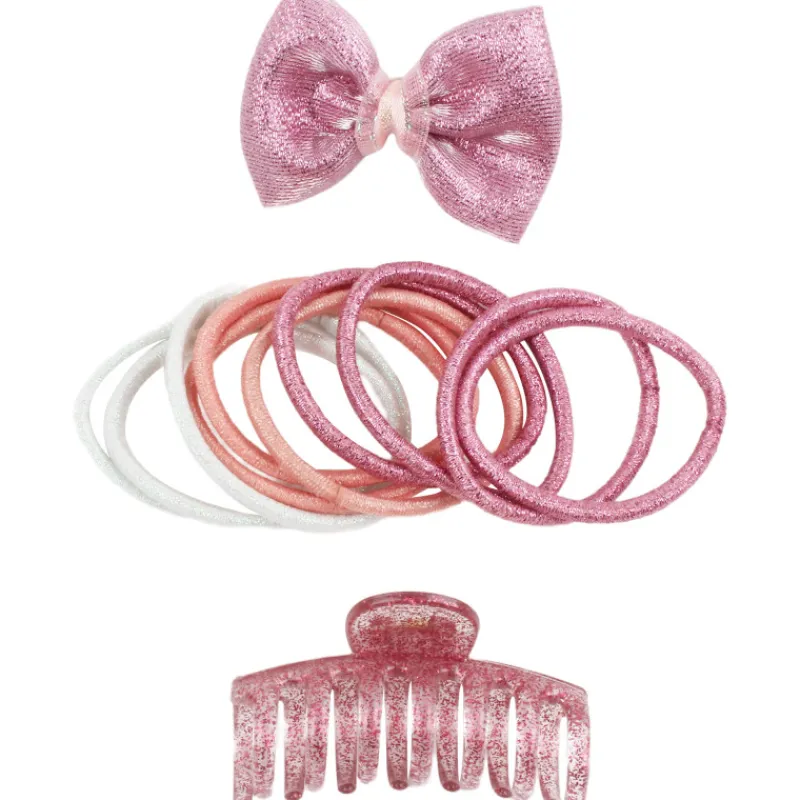 Lasten hiussetti sisältää kauniin vaaleanpunaisena kimaltavia hiuslenkkejä, rusettipinnin sekä hainhampaan.