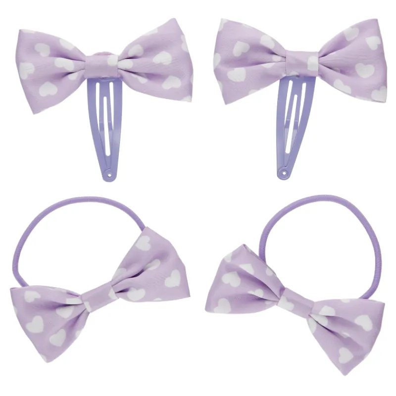 Lasten hiussetti sisältää yhteensopivat hiuspinnit ja hiuslenkit, joissa molemmissa sydänkuvioinen rusettikoriste.