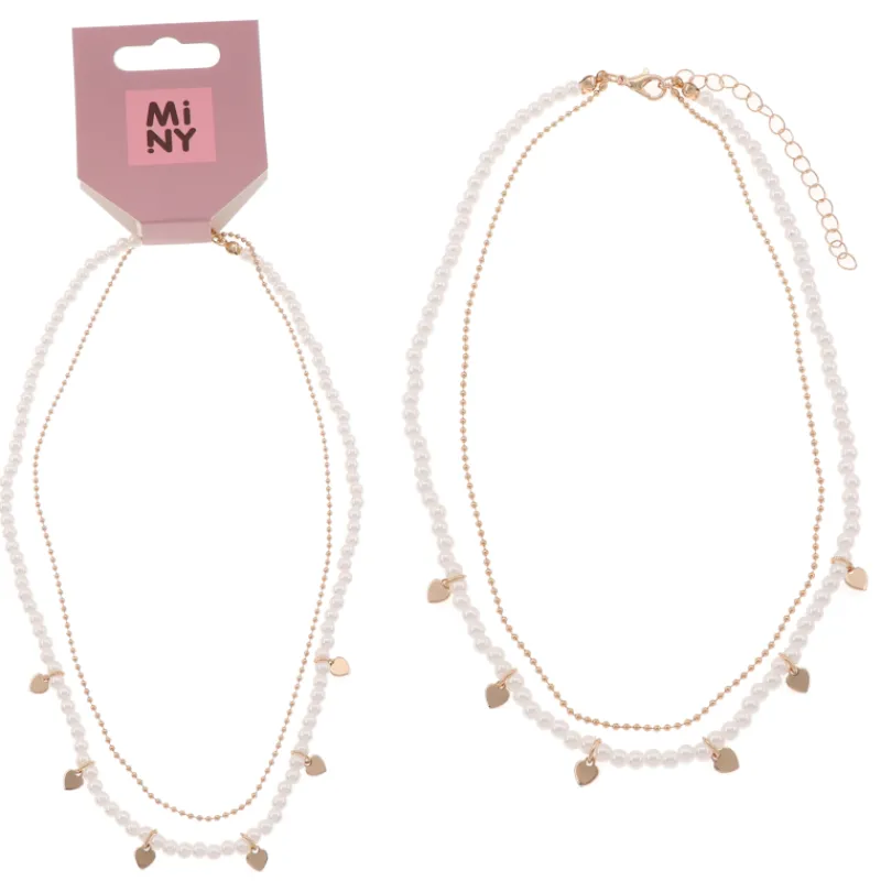Viehättävä, sydänkoristeinen helmikoru ja kullanvärinen kaulaketju samassa kaulakorussa. Kaksiketjuinen kaulakoru tuo asuun lumoavaa kauneutta.