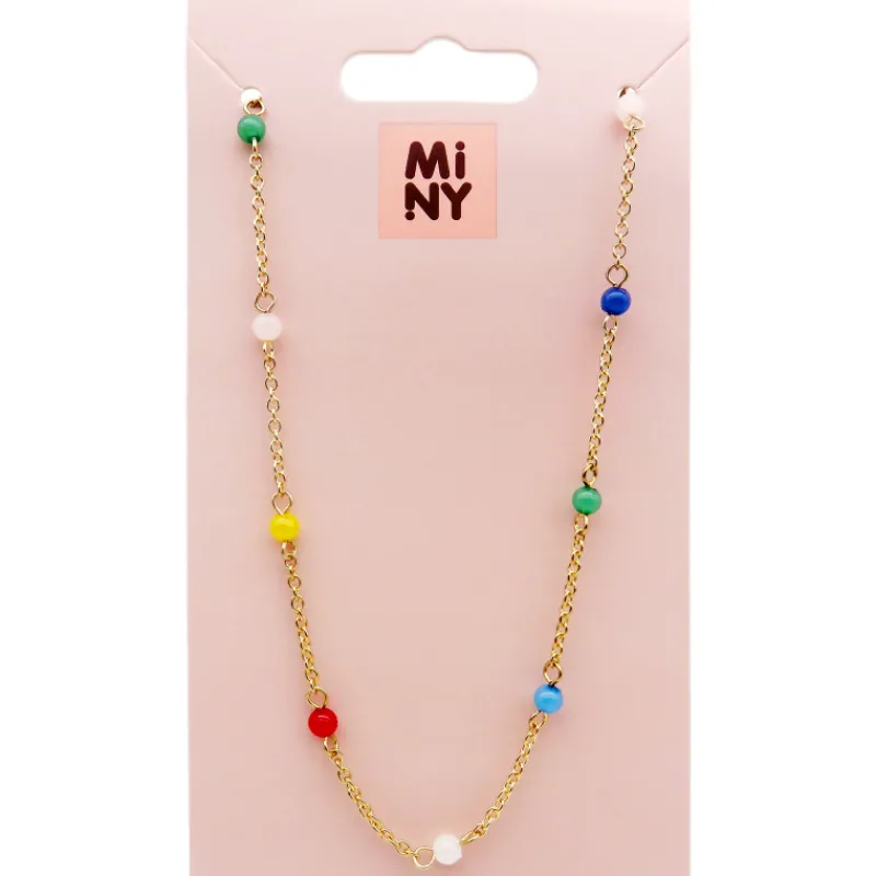 Miny-kaulakoru kullanvärisellä ketjuosalla ja monivärisillä helmisomisteilla. Nikkeli-vapaa.