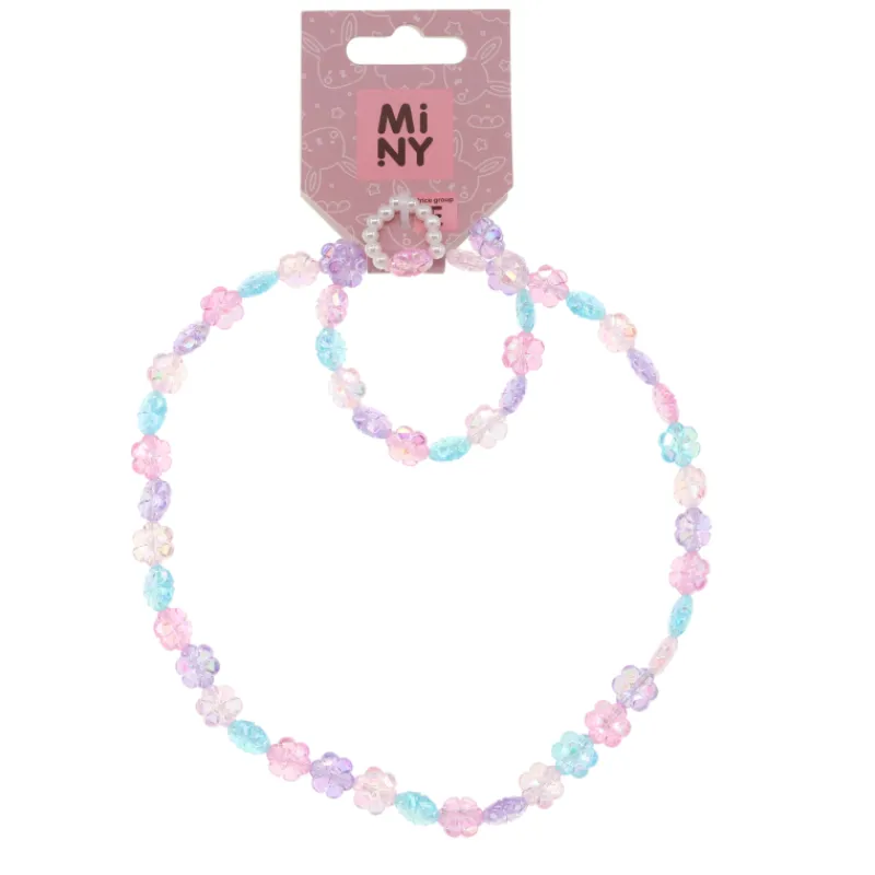 Hempeän kaunis korusetti sisältää kukkakivikoristeisen kaulakorun, rannekorun ja sormuksen.