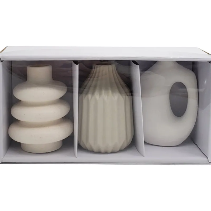 Miny-maljakkosetti sisältää kolme pienikokoista maljakkoa beigen ja valkoisen sävyissä. Maljakot on valmistettu kivitavarasta. Pakkauksen koko on 23 x 8 x 10 cm.