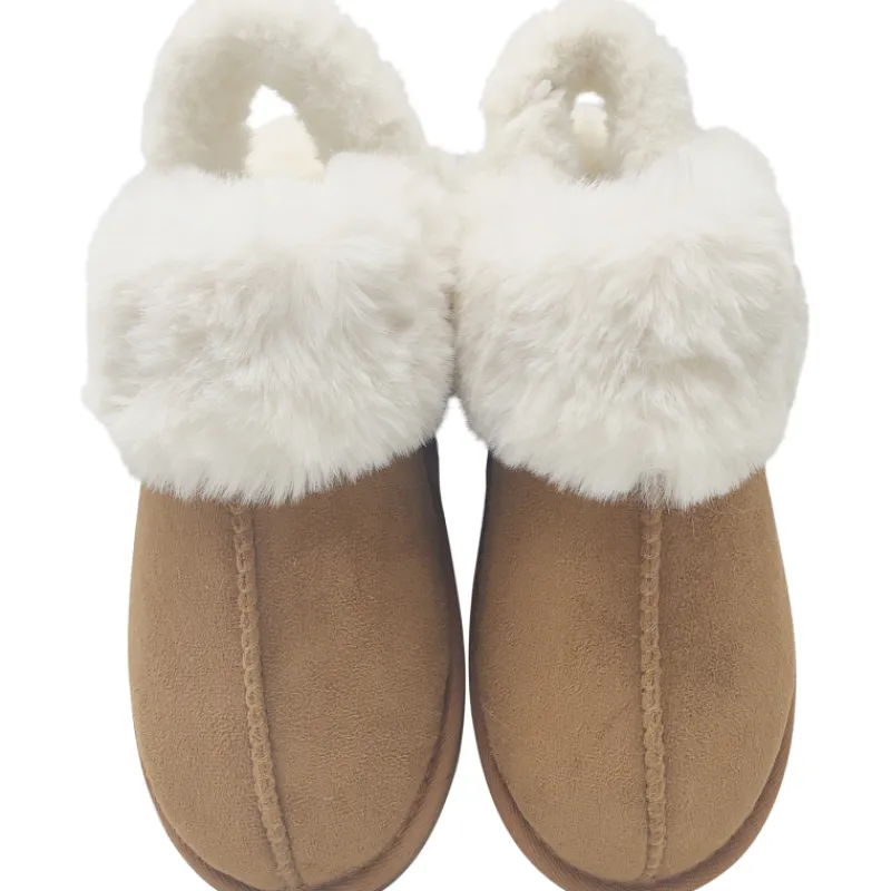 Ruskeat tossut, joissa on pehmeä valkoinen vuori, tarjoavat mukavuutta ja lämpöä.