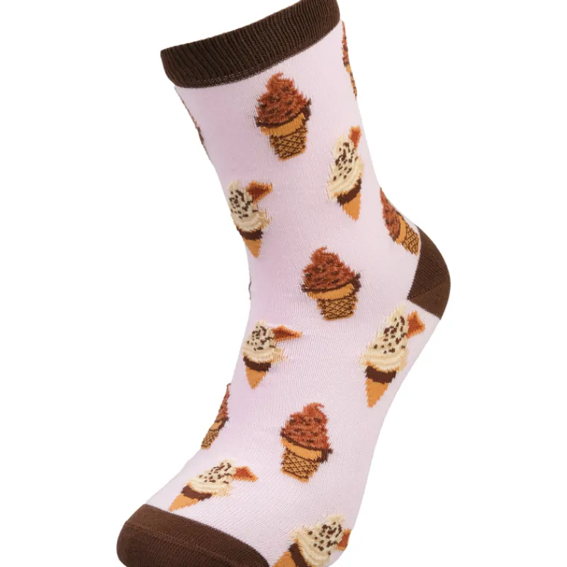 Jäätelötötteröillä kuvioidut sukat tuovat piristystä arkipukeutumiseen.