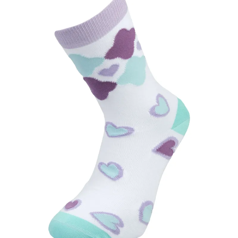 Sukissa on iloisen värikkäitä sydänkuvioita, jotka tuovat iloa asuun.