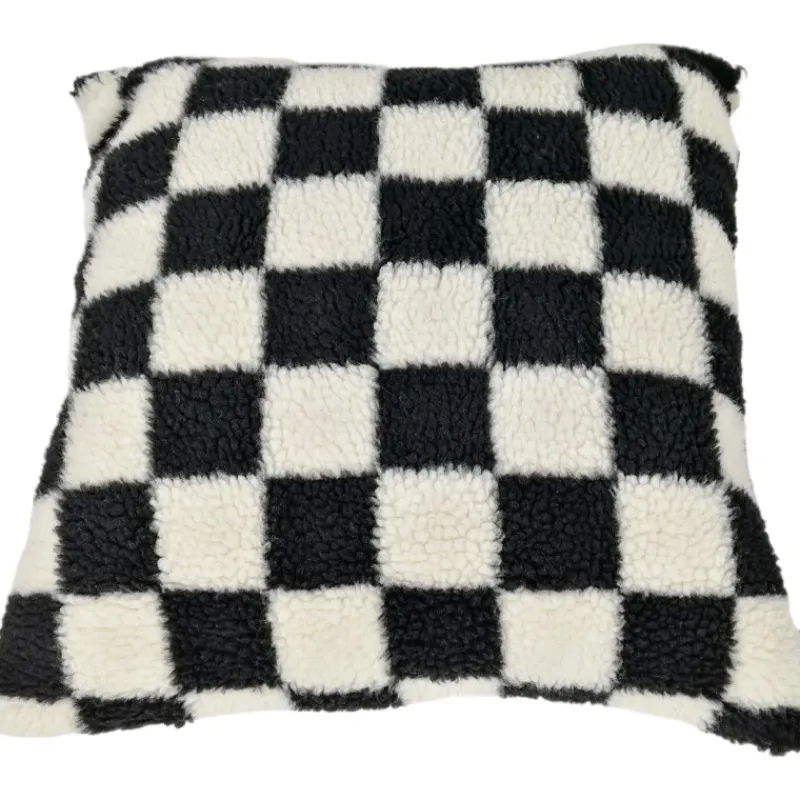 Teddykankainen Miny-koristetyyny piristää sisustusta mustavalkoisella ruutukuosillaan.