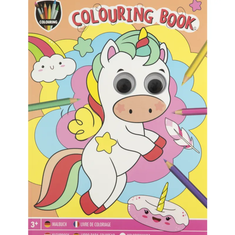 Yli 3-vuotiaille lapsille soveltuva värityskirja, jossa väritettävällä hahmolla on liikkuvat silmät.