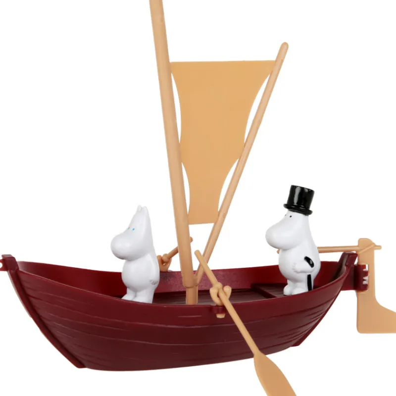 Muumipapan pienoismalli. Veneessä on airot, joilla voi soutaa tuulen tyyntyessä. Mukana tulevat tietysti veneen kippari Muumipappa ja miehistön jäsen Muumipeikko.
