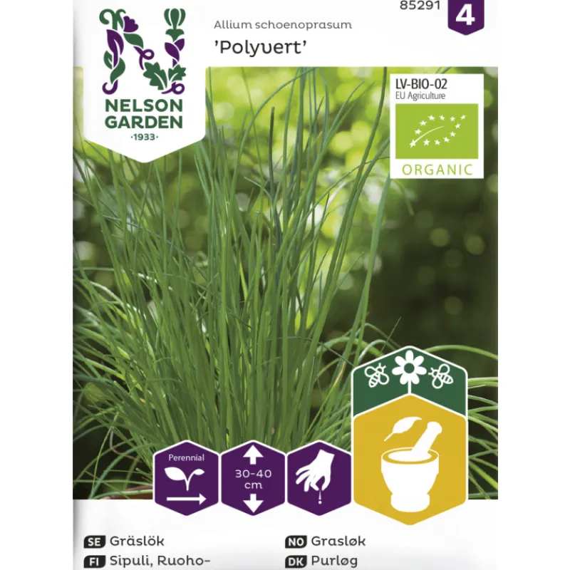 Luomulaatuinen siemen. Ruohosipulin lehdissä on hieno aromi ja mieto sipulinmaku. Kukat liilat, kauniin pyöreät. Korjaa lehtiä vähitellen ja käytä tuoreena salaattiin ja kylmiin kastikkeisiin. Myös syötävät kukat käyvät koristeeksi.