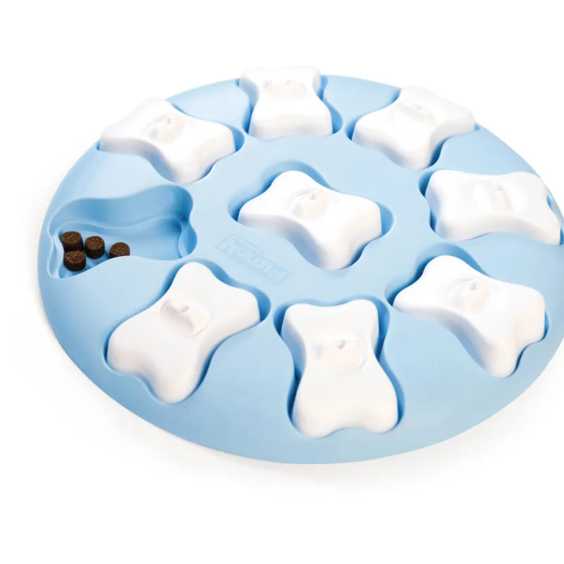 Nina Ottosson aktivointilelu on koiran interaktiivinen pulmalelu. Koiran lelussa on yhteensä yhdeksän lokeroa, jotka ovat peitetty irrotettavilla muovisilla luupaloilla. Piilota karvakuonon suosikkiherkut lokeroihin ja katso, kuinka koirasi oppii tassuttamaan luita paljastaakseen palkinnon. Koiran palapeli on helppo puhdistaa lämpimällä vedellä ja saippualla käyttökertojen välillä.