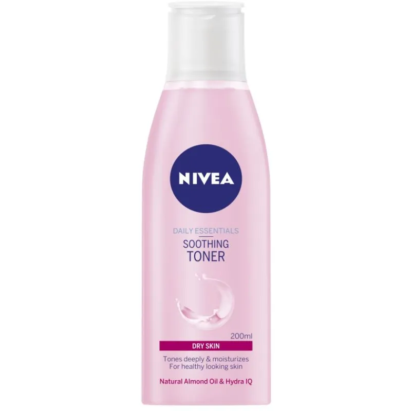 Nivea Daily Essentials Soothing Toner -kasvovesi kosteuttaa ja rauhoittaa kuivaa ja herkkää ihoa. Kasvovesi viimeistelee ihonpuhdistuksen ja valmistelee sen kosteusvoiteen levitystä varten. Manteliöljyä ja kosteuttavan Hydra IQ -koostumuksen sisältävä kasvovesi hellii ihoa ja auttaa sitä säilyttämään luonnollisen kosteustasapainon. Kasvoveden mieto koostumus on dermatologisesti testattu. Pakkauskoko 200 ml.