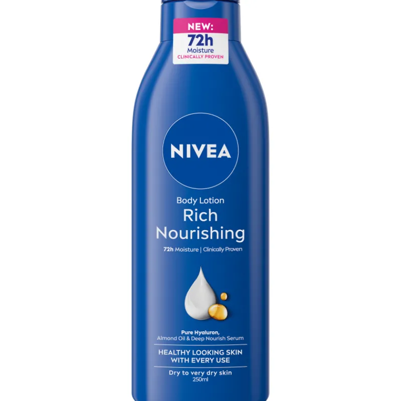 Nivea Rich Nourishing -vartaloemulsio tekee ihosta terveen näköisen ja syväkosteuttaa sitä 72 tunnin ajan. Se tekee ihosta huomattavan pehmeän ja sileän. Emulsio sisältää puhdasta hyaluronihappoa, manteliöljyä ja ihoa syvältä ravitsevaa seerumia. Tuote imeytyy nopeasti eikä jätä tahmaista tunnetta.