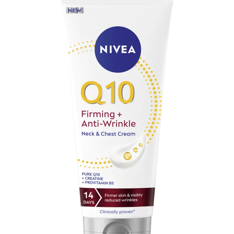 NIVEA Q10 Firming + Anti-Wrinkle Neck & Chest Cream -vartaloemulsio kaulalle ja dekolteelle auttaa tekemään ihosta pehmeämmän sekä kimmoisamman. Q10:tä, kreatiinia ja B5-provitamiinia sisältävä koostumus on erityisesti kehitetty herkälle kaulan sekä dekolteen iholle. Ihoystävällisyys dermatologisesti hyväksytty.