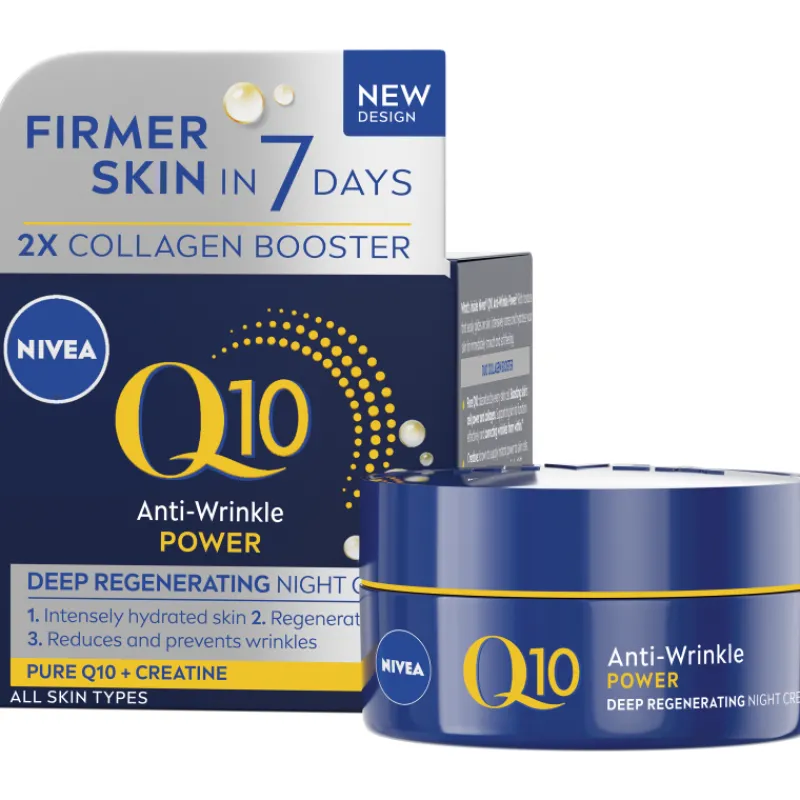 Nivea Q10 Anti-Wrinkle Power Deep Regenerating -yövoide auttaa uudistamaan ihoa tehokkaasti yön aikana. Sen koostumus sisältää puhdasta Q10:tä, joka antaa ihosoluille energiaa. Voiteen kreatiini auttaa tekemään ihosta kiinteämmän ja hyaluronihappoa täyttää ihoa kosteudella sitoen kosteutta ihoon.