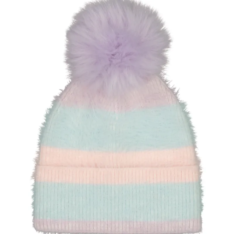 Pastellinsävyistä, raidallista pipoa somistaa suurikokoinen tekoturkistupsu, väri vaaleanvihreä/vaaleanpunainen/vaaleanlila.