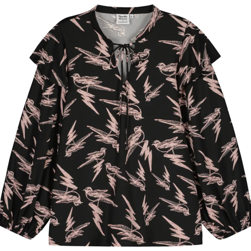Mustaan kuosiin on printattu vaaleanpunaisia lintuja.