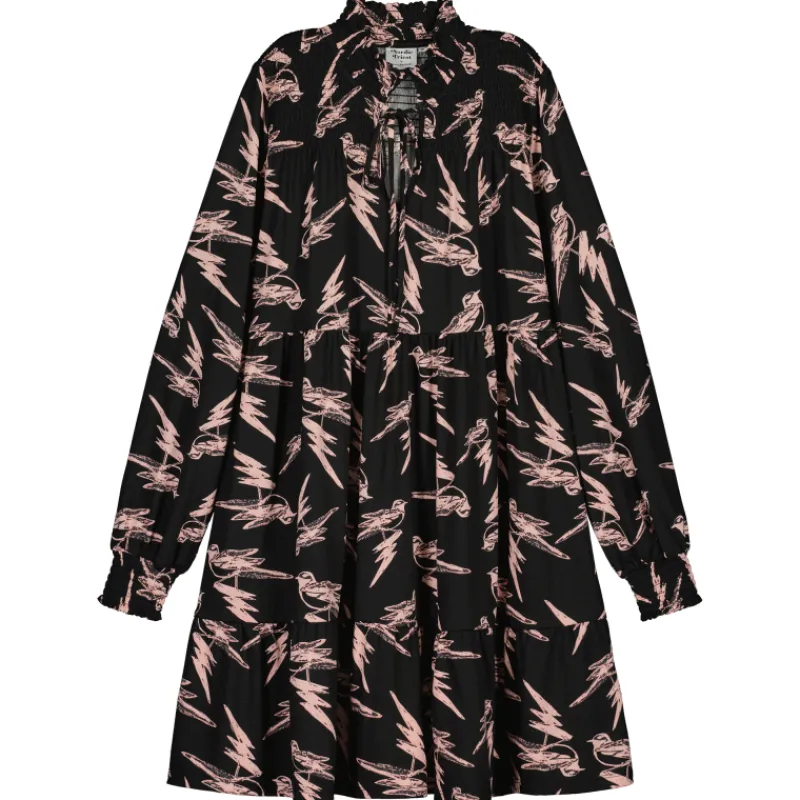 Mustaan kuosiin on printattu vaaleanpunaisia lintuja.
