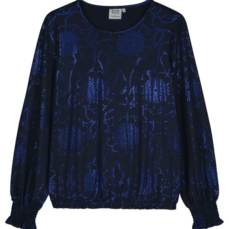 Nordic Tricot by Ivana Helsinki -malliston naisten paita erittäin pehmeää trikoota. Paita on kuvioitu sinisellä metallinhohtoisella Paulakukka-printtikuosilla.