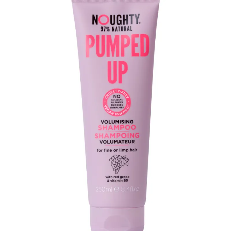 Tuuheuttava Noughty Pumped Up -shampoo. Kevyt, öljytön koostumus puhdistaa hiukset jättäen ne ilmaviksi ja kiiltäviksi. Rypäleuute ja B5-vitamiini tekevät hennoista hiuksista helposti muotoiltavat.