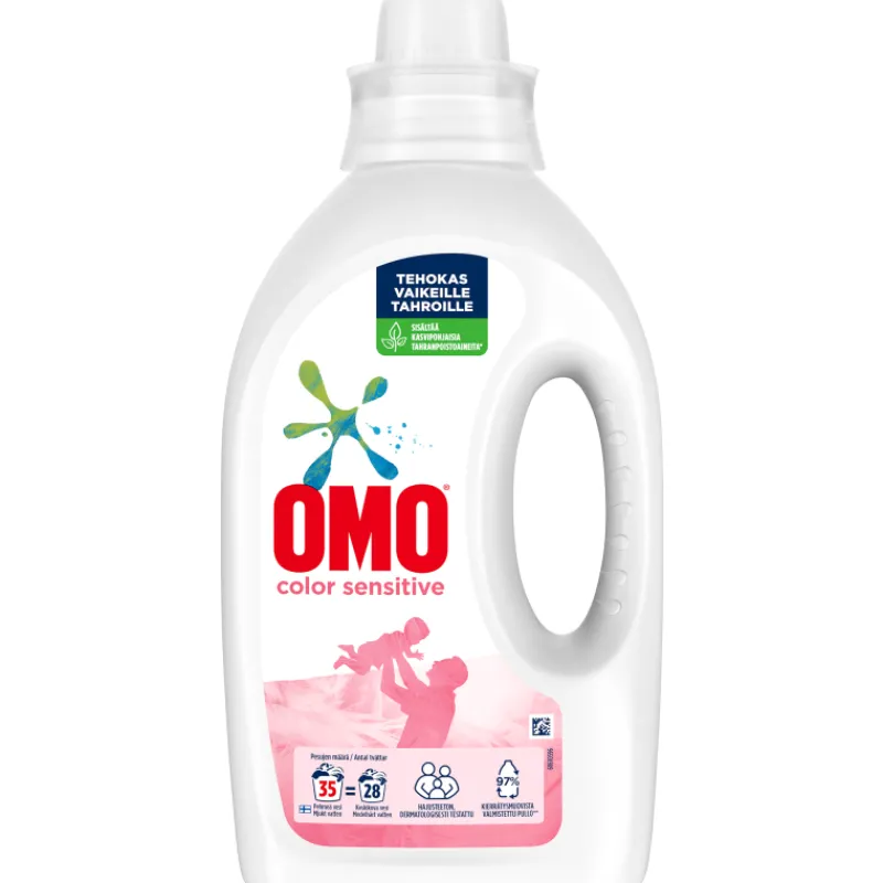 Omo Color Sensitive -pyykinpesuneste poistaa tehokkaasti ja hellävaraisesti vaikeatkin tahrat jopa alhaisissa lämpötiloissa. Se liukenee hyvin veteen, eikä jätä vaatteisiin ihoa herkästi ärsyttäviä pesuainejäämiä. Samalla se auttaa säilyttämään vaatteiden värit kirkkaina pesu toisensa jälkeen. Näin värilliset vaatteet pysyvät kauniina ja niiden käyttöikä pitenee.