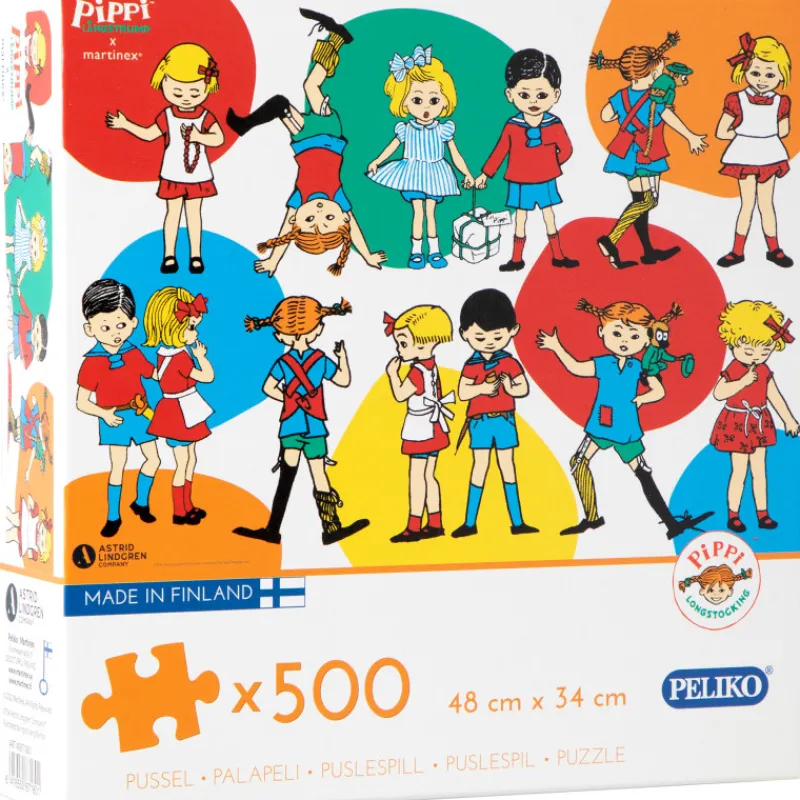 500 palan palapelin värikkäässä kuvassa esiintyvät maailman vahvin tyttö Peppi Pitkätossu, hänen ystävänsä Tommi ja Annika sekä lemmikkiapina Herra Tossavainen.