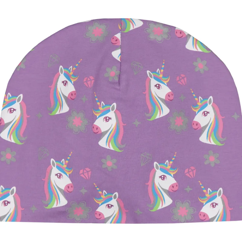 Kevyessä, kaksikerroksisessa pipossa on suora malli ilman käännettä. Kiva yksisarvinen-kuosi, jossa on lisänäkyvyyttä tuovia heijastava printti-kuvioita. Väri lila.